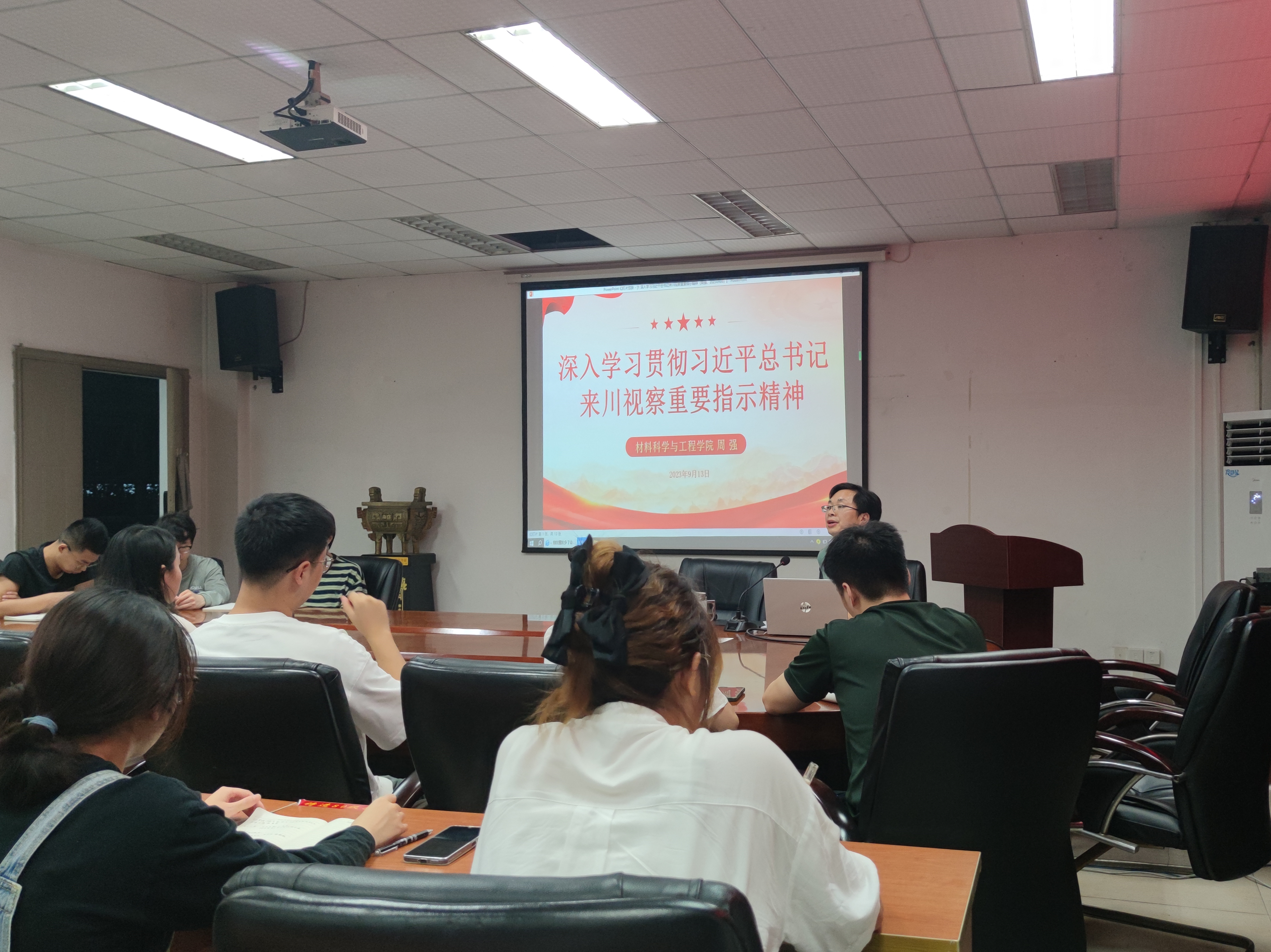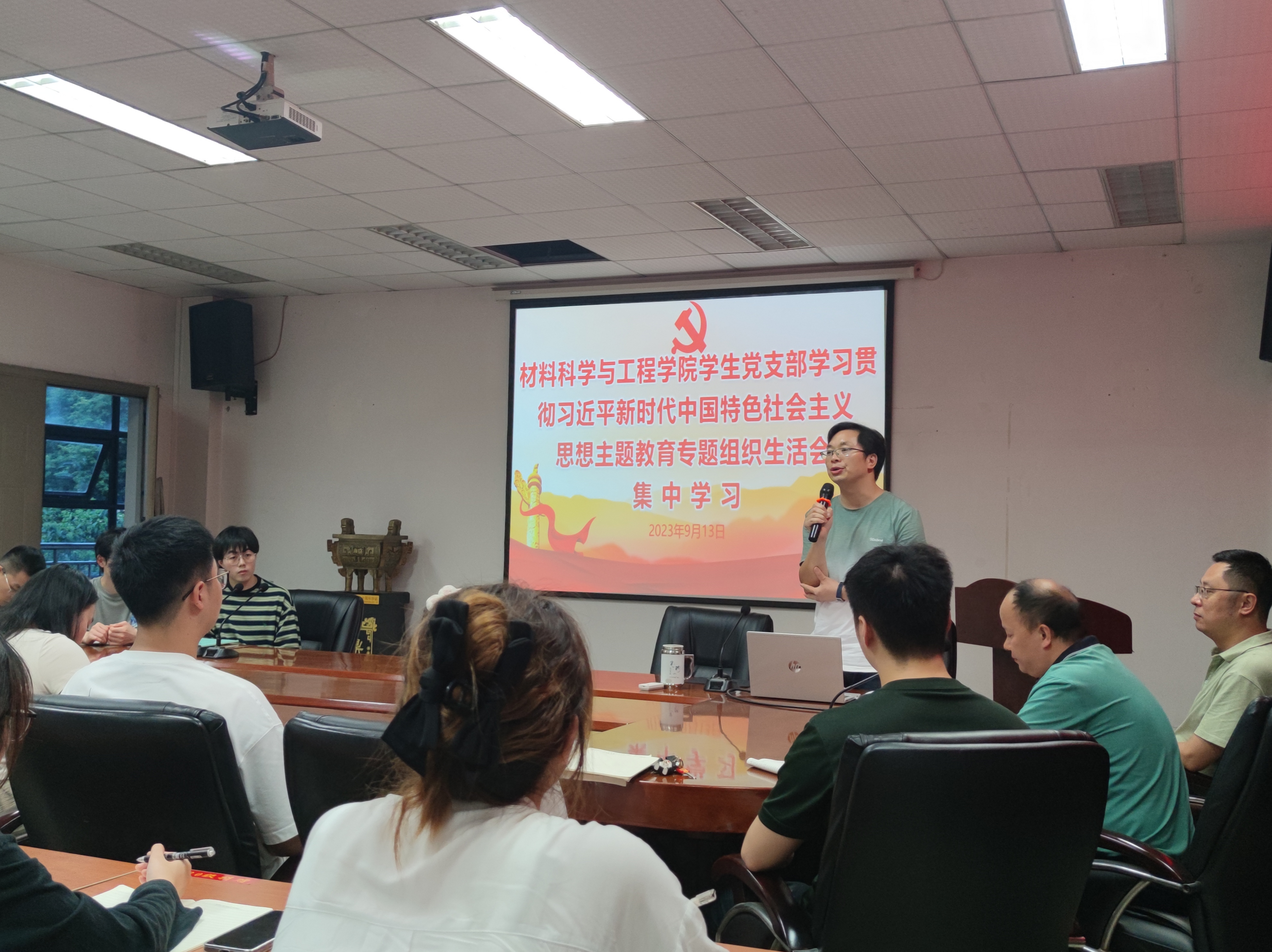 2023年9月13日19:00,材料科学与工程学院学生党支部在5A427开展了“学习贯彻习近平新时代中国特色社会主义思想”主题教育专题党课暨专题组织生活会集中学习。学院党委委员,组织员周强老师主讲,会议研究生党支部书记闵忠华主持,全体学生党员参会,学院党委副书记马洪波参加会议。