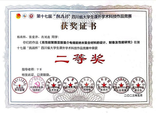 2023年5月14-16日,由共青团四川省委、中共四川省委组织部、四川省省科协、四川省教育厅、四川省科技厅等共同举办的第十七届“挑战杯”四川省大学生课外学术科技作品竞赛决赛在成都大学如期举行。由材料科学与工程学院2019级本科生杨尚科、张爱萍、肖刘鑫团队提交参赛的作品《高性能聚酰亚胺基介电储能纳米复合材料的设计、制备及性能研究》在来自四川大学、电子科技大学、西南交通大学、西南石油大学、成都中医药大学等高校的竞争角逐中荣获二等奖。