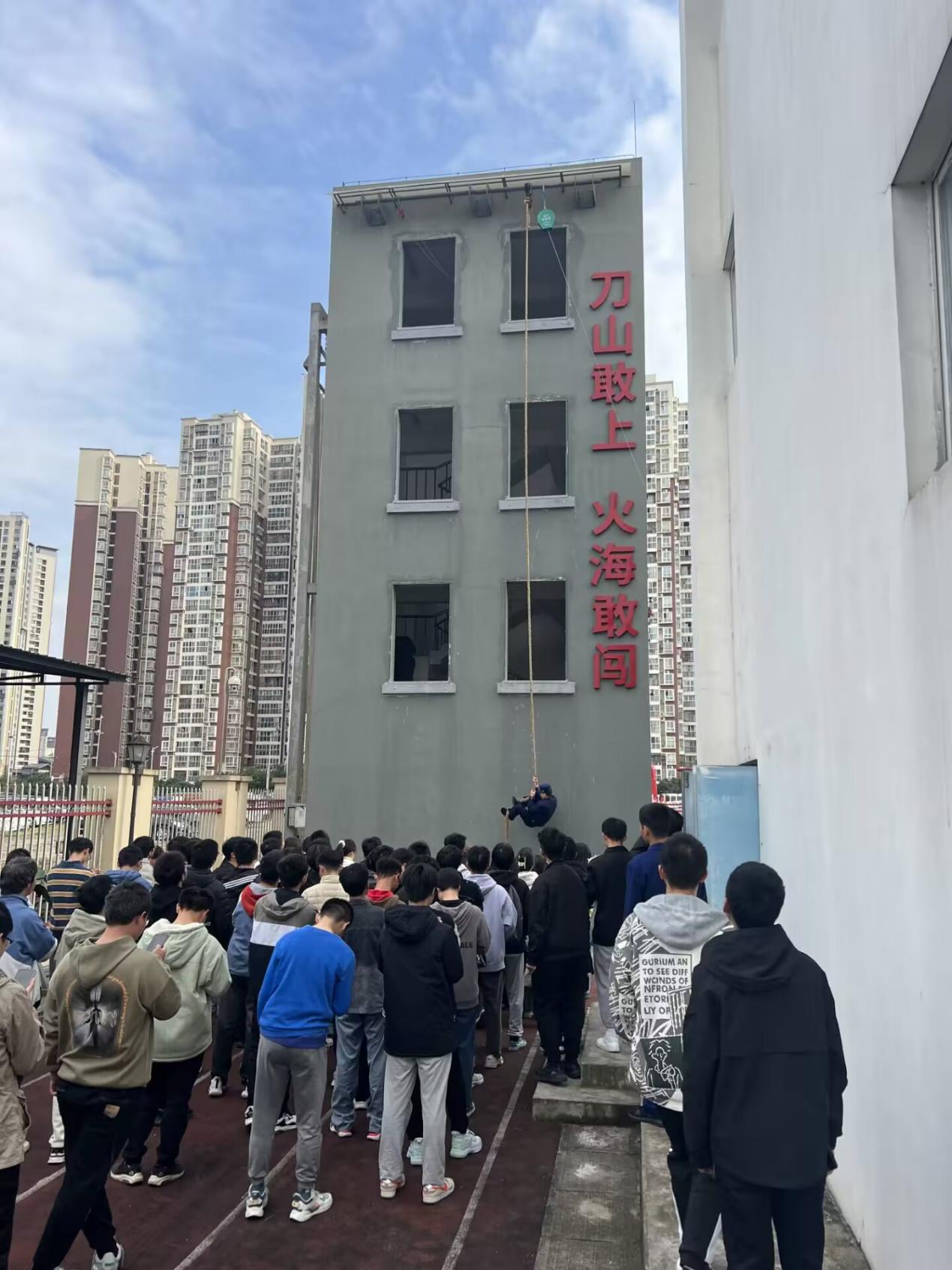 消防员展示徒手爬绳技术