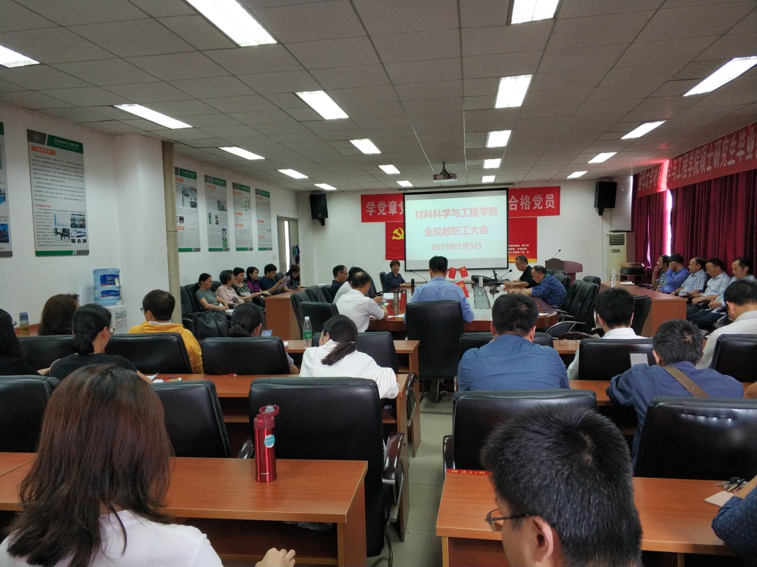 9月5日下午,材料学院在5A-427会议室召开新学期第一次全院教职工大会,传达党委中心组扩大学习会议精神,安排布置新学期的主要工作,会议由学院院长栾道成主持。