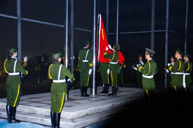 早上7时,英姿飒爽的国旗护卫队队员们迈着铿锵有力的步伐护送国旗入场。在雄壮的国歌中,五星红旗冉冉升起,在黎明前夜中迎风飘扬,全体师生齐唱国歌行注目礼。