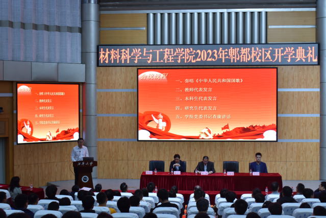 10月8日上午,材料科学与工程学院在四教报告厅举行2023级新生开学典礼。学院党委书记查康、院长张勤勇、党委副书记、纪委书记马洪波、党委委员、副院长陈宝书,党委委员、副院长王正云、学院专职组织员、党政办、教学科研办、学工办、教学系、实验中心的负责人出席,郫都校区2023级全体研究生、本科新生参加。党委副书记、纪委书记马洪波主持开学典礼。