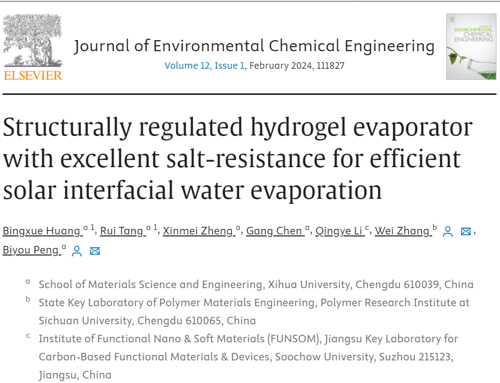 近日,材料科学与工程学院彭必友教授团队在国际一流的环境化学工程学报杂志Journal of Environmental Chemical Engineering(Q1,IF: 7.7)发表题为“Structurally regulated hydrogel evaporator with excellent salt-resistance for efficient solar interfacial water evaporation”的研究论文。黄冰雪博士、研究生唐锐为论文的第一作者,四川大学高分子材料工程国家重点实验室张伟教授、betway88西汉姆联材料科学与工程学院彭必友教授为通讯作者。该项研究工作得到了四川省科技厅重点研发项目(Grant Nos. 2022YFG0366; 2023NSFSC04430)的支持。