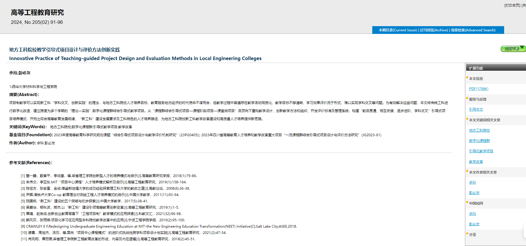 近日,材料科学与工程学院彭必友教学科研团队在CSSCI来源期刊《高等工程教育研究》发表名为“地方工科院校教学引导式项目设计与评价方法创新实践”的教研论文,论文第一作者为材料学院余玲高级实验师。该项研究工作得到2023年度高等教育bw必威西汉姆联规划课题“综合引导式项目设计与教学评价机制研究”(23PG0405)、2023年四川省高等教育人才培养和教学改革重大项目“一流课程群综合引导式项目设计与评价方法研究”、2023年betway88西汉姆联教育教学改革重点项目“综合引导式项目教学培养创新型人才的研究与实践”(xjjg2023003)的支持。
