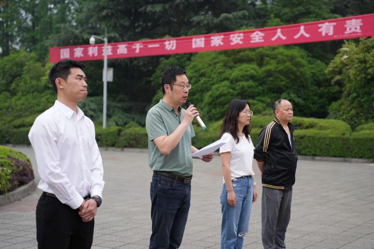 上午6点57分,旗手护送国旗至旗台上并准备升旗,方阵分两组走至明德广场大花坛两旁站定。随后,升国旗,奏唱国歌;升旗仪式结束后,学生代表唐瑗发言,号召大学生提高全民国家安全意识,切实担负起国家安全的责任和义务;马洪波副书记做主题教育发言,他强调国家安全是国家的生命线,是人民的幸福线,大学生要坚定贯彻总体国家安全观,为维护国家安全和社会稳定,为实现中华民族伟大复兴的中国梦而努力奋斗。