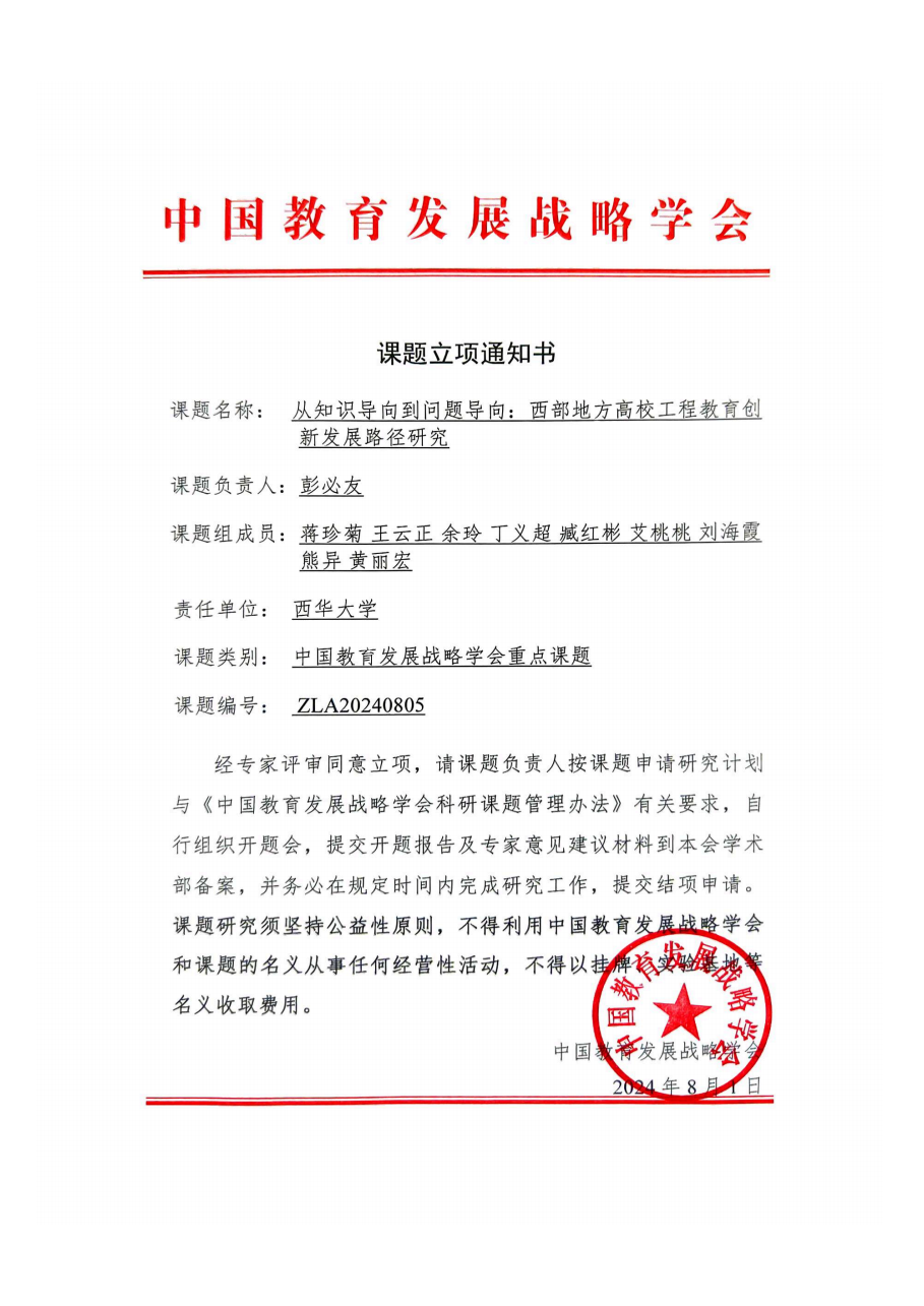 近日,中国教育发展战略学会2024年课题立项通知发布,我校彭必友、蒋珍菊、王正云等老师申报的课题“从知识导向到问题导向:西部地方高校工程教育创新发展路径研究”获批2024年中国教育发展战略学会重点课题立项。