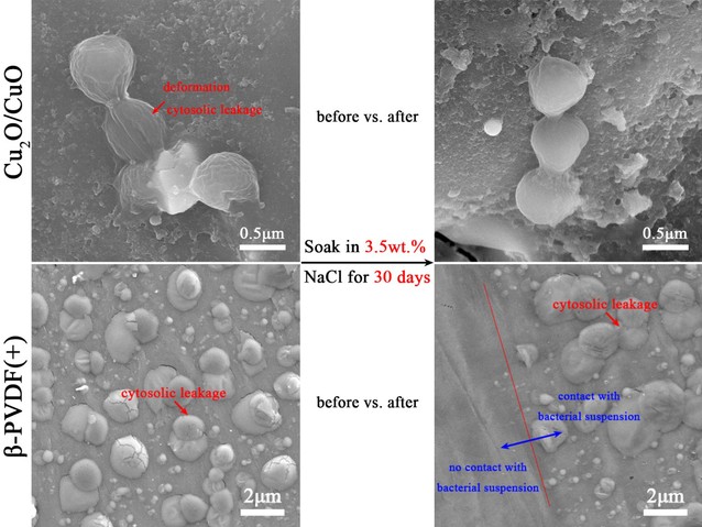 细菌与微弧氧化Cu2O/CuO涂层及极化β-PVDF防护膜作用后样品表面粘附细菌的形态对比
