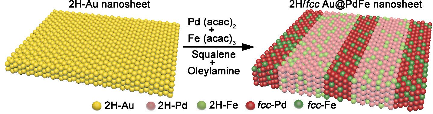 示意图 1. 以 2H-Au 纳米片为模板外延生长 PdFe 合金得到 2H/fcc Au@PdFe 纳米片。