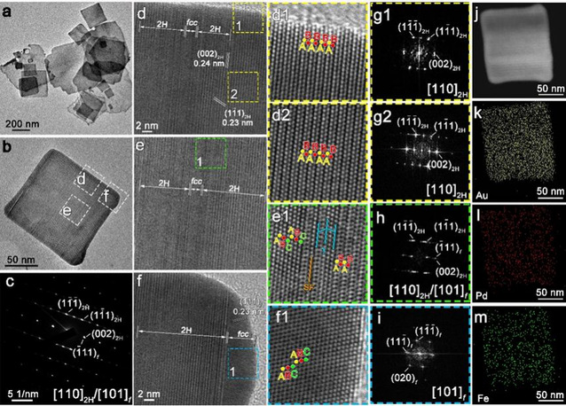 图 1.(a) 2H/fcc Au@Pd0.66Fe0.34 NSs 的 TEM 图。(b)高倍率 TEM 图和(c)代表性2H/fcc Au@Pd0.66Fe0.34 NS 沿[110]2H/[101]f区轴的相应 SAED 图。(d,e)代表性 2H/fcc Au@Pd0.66Fe0.34 NS 的边缘(d)、中心(e)和角区域(f)的 HRTEM 图像。(d1)和(d2)是(d)中选定的黄色区域的高倍率图像。(e1)和(f1)分别是(e)和(f)中选定的绿色和蓝色区域的高倍率图像。(g1)和(g2)分别是从 d1 和 d2 获得的对应 FFT 模式。(h)和(i)分别是从 e1 和 f1 获得的相应 FFT 模式。(j)2H/fcc Au@Pd0.66Fe0.34 NS 的HAADF-STEM 图像和(k-m)相应的 STEM-EDS 元素分布图。