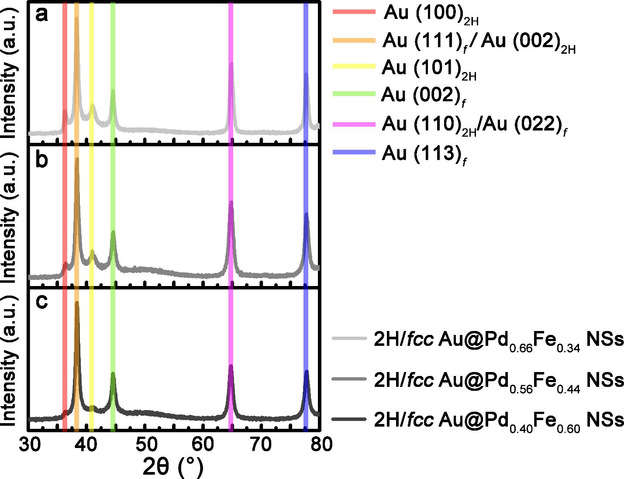 2. 2H/fcc Au@Pd0.66Fe0.34 NSsa,浅灰色)、2H/fcc Au@Pd0.56Fe0.44 NSsb,灰色)和2H/fcc Au@Pd0.40Fe0.60 NSsc,深灰色)的XRD图谱。竖向的红、橙、黄、绿、紫、蓝粗线分别代表Au1002HAu111f/Au0022HAu1012HAu002fAu1102H/Au022fAu113f的特征峰。