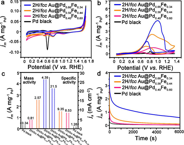 3.a 2H/fcc Au@Pd0.40Fe0.60 NSs2H/fcc Au@Pd0.56Fe0.44 NSs2H/fcc Au@Pd0.66Fe0.34 NSs Pd黑的CV曲线。(b Pd负载质量归一化的CV曲线,以及(c2H/fcc Au@Pd0.40Fe0.60 NSs2H/fcc Au@Pd0.56Fe0.44 NSs2H/fcc Au@Pd0.66Fe0.34 NSsPd black在含1.0 M KOH1.0 M 甲醇的水溶液中的质量活性(jm)和比活性(js)直方图,扫描速率为50 mV s-1。(d1.0 M KOH1.0 M甲醇的N2饱和水溶液中2H/fcc Au@Pd0.40Fe0.60 NSs2H/fcc Au@Pd0.56Fe0.44 NSs2H/fcc Au@Pd0.66Fe0.34 NSsPd黑的MOR计时电流结果。