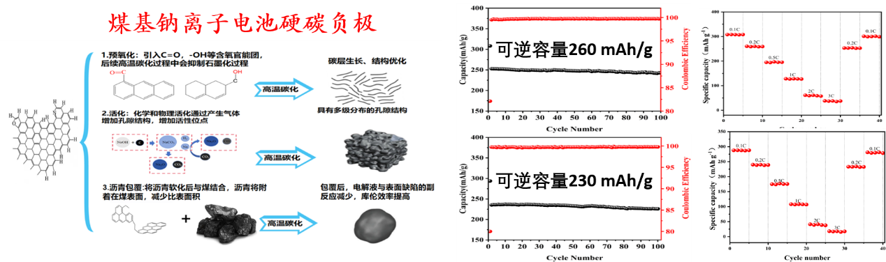通过对不同制备路线和工艺的深入研究,解析了硬碳材料无定形孔结构和钠离子存储性能的构效关系;以生物质或化石燃料为前驱体,批量化制备出了高容量、髙首效、长循环的硬碳负极。