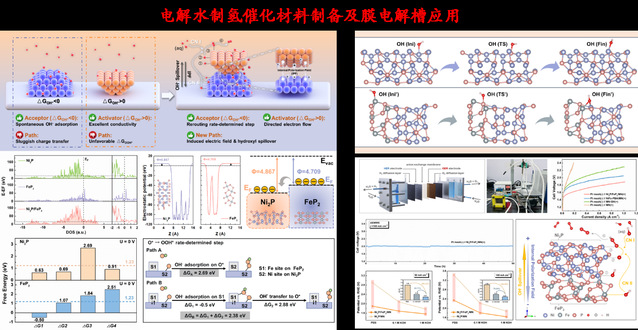 突破了四质子-电子转化过程含氧中间体的传统运输路径,建立了分子内高密度极化电场的金属M1-非金属-金属M2溢流通道,动态刻画了催化界面上基于Sabatier原理的OH定向迁移的机理,自主设计并搭建了第三代阴离子交换膜电解槽(AEM)装置,提出了适用于低浓度碱液环境的AEM电解槽高效稳定催化剂的设计指标与方法。