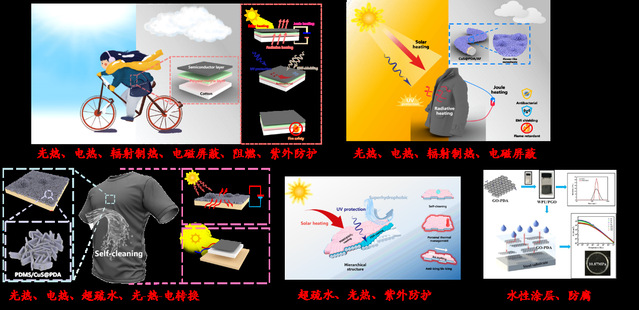 通过原位聚合-喷涂、两步原位聚合、静电-配位等方法在织物纤维表面构建多层次结构涂层,实现光热转换与超疏水、焦耳加热、被动辐射加热、电磁屏蔽、紫外防护、抗菌阻燃等功能的高效协同,为多功能光热涂层的设计与制备提供新思路和新方法,研究成果在柔性防除冰、个人热管理、热电转换等方向具有巨大的应用前景。此外,还研究二维材料的表面改性及其在水性涂层中的防腐应用。