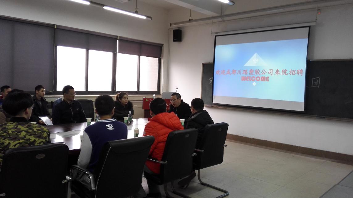 2016年11月24日上午10:30,我院校企合作单位---成都川路塑胶集团人事经理一行来到学院进行2017届毕业生招聘工作,公司计划在我院招聘4名应届毕业生。