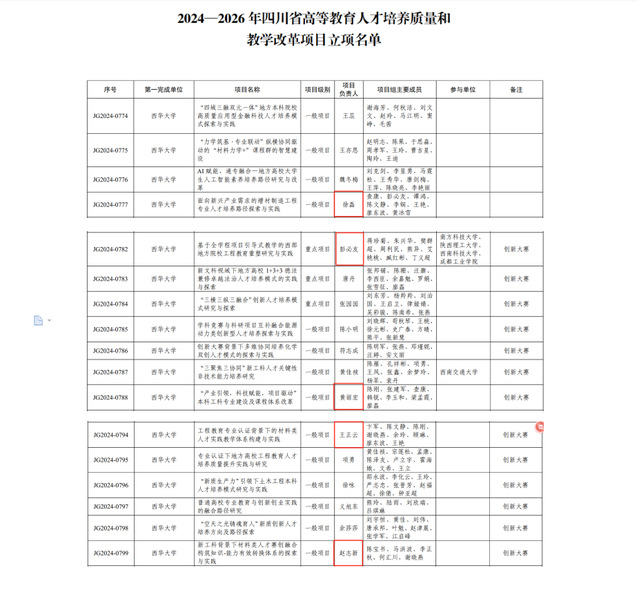 近日,四川省教育厅正式公布了《四川省教育厅关于公布2024-2026年四川省高等教育人才培养质量和教学改革项目立项名单的通知》,全省1241个省级教改项目予以立项建设。betway88西汉姆联全校一共立项43项,其中材料科学与工程学院获批5项立项,是学院历史以来最多的一次。我院彭必友教授申报的“基于全学程项目引导式教学的西部地方院校工程教育重塑研究与实践”获批重点项目立项,王正云副院长申报的“工程教育专业认证背景下的材料类人才实践教学体系构建与实践”、黄丽宏教授申报的“‘产业引领,科技赋能,项目驱动’ 本科工科专业建设及课程体系改革”、徐磊副教授申报的“面向新兴产业需求的增材制造工程专业人才培养路径探索与实践”和赵志新老师申报的“新工科背景下材料类人才赛创融合构筑知识-能力有效转换体系的探索与实践”获批一般项目立项。