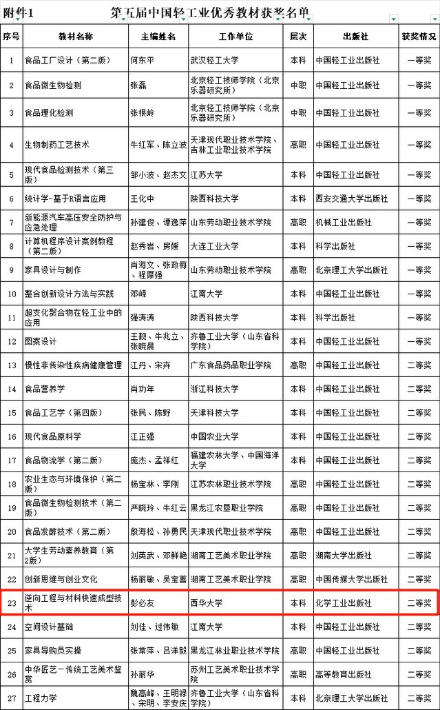 2025年3月26日,在2025年全国轻工教育工作会议暨全国轻工、食品产业职业教育教学指导委员会年会上,由材料科学与工程学院彭必友教授、陈刚副教授和研究生杨韬主编的《逆向工程与材料快速成型技术》荣获第五届中国轻工业优秀教材二等奖!