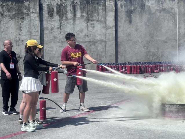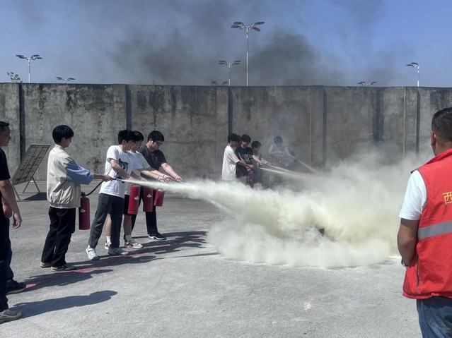 活动伊始,学院辅导员雷云中老师强调了本次活动的重要性,并和学生一起参与到演练中来。安全指导员史老师详细讲解了火灾隐患识别、初期火情扑救等知识,并重点演示了干粉灭火器的操作步骤——“一提、二拔、三握、四压”。在随后的实操环节中,数十名学生代表分组进行灭火演练。面对模拟火源,同学们冷静判断风向、规范操作器材,迅速扑灭火苗。2024级学生王俊阳表示:“以前只在课本上见过灭火器,今天第一次亲手使用,才发现细节决定成败,比如必须站在上风口、对准火焰根部喷射,这些经验非常实用。”