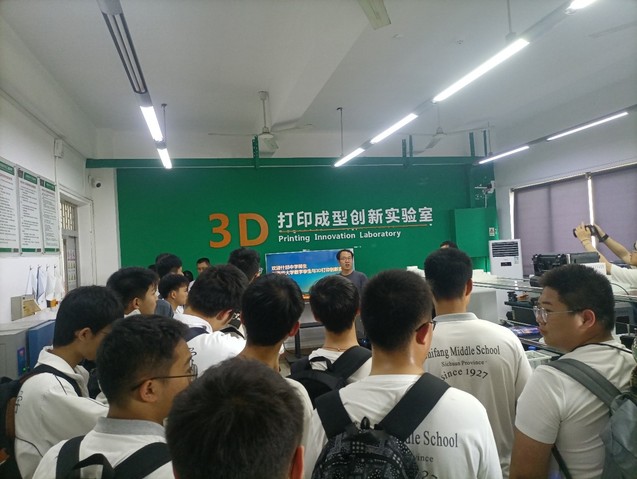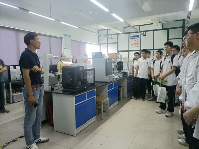 随后,陈刚副教授补充介绍实践站的相关设备以及3D打印的工作原理。接着带领学生进入实践环节。在摆放着十余台先进设备的实验区,熔融沉积成型设备、DLP光固化快速成型机、3D打印气溶胶雾化系统等不同原理的3D打印机依次排开。通过建模-扫描-切片-打印全流程拆解,60名学生被划分为三大组九小组,在专业志愿者指导下展开沉浸式学习。