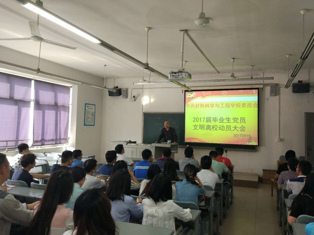 做好毕业生党员教育管理服务工作事关学校毕业生文明离校工作大局,为进一步抓好学院毕业生文明离校工作,5月15日材料学院在5B409召开了2017届毕业生党员文明离校动员大会,学生总支书记郭忠林、毕业班学生党支部书记、毕业生党员共计100余人参加了此次会议,会议由郭忠林主持。