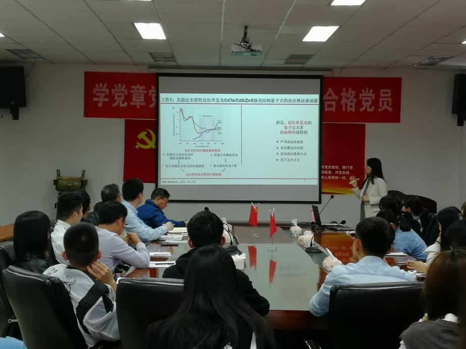 汪婕以“纳米材料的湿法合成及其在生物成像和电催化等方面的应用”为题,首先介绍了已经开展的研究工作:研究了贵金属催化剂,不稳定状态和稳定状态(不同晶型)对催化性能的影响和厚度控制Au@lr核壳结构纳米片的晶格变化及晶格结构对其水合肼点氧化性能的影响。详细讲解了纳米材料因其独特的物理化学性质在电光声热磁等领域有着广泛的应用。其中,量子点和贵金属纳米材料分别以其优异的光学和电学性能收获了尤为众多的关注。介绍了二六族量子点和碳量子点的水相合成及其在生物成像上的应用,并重点讨论了不同晶相对贵金属纳米材料电催化性能的影响。