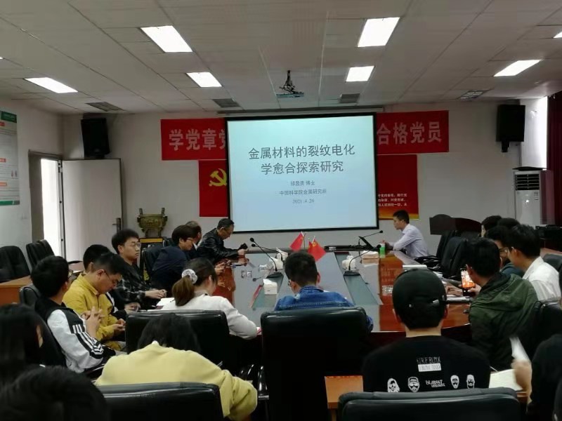 郑显贵以“金属材料的裂纹电化学愈合探索研究”为题,通过介绍裂纹这种常见的金属材料的失效形式的危害,引出材料裂纹修复的迫切性和重要性。郑博士详细介绍了一种通过添加特定修复剂和催化剂,并辅以电化学法使得金属中的裂纹实现自修复的技术,系统研究了愈合组分的生长方式,修复机理,并采用单向拉伸法对愈合效率进行了评价。最后,郑博士向同学们提出几点期望:“科研过程中遇到难题时,往往也像裂纹一样,在方案有瑕疵时不必急于全盘否定,应该仔细分析症结所在,步步优化,在原有基础上不断精进。学以致用,知行并进!”