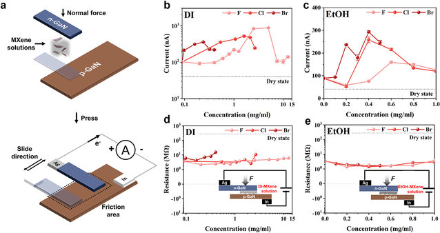 图1:气体分子辅助卤素端基MXenes的高效电化学剥离及其在耐磨损摩擦伏特器件中的增强作用示意图。