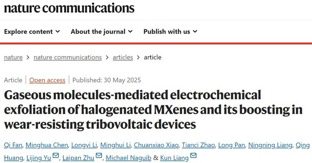 近期,材料科学与工程学院余黎静副教授与中国科学院宁波材料技术与工程研究所梁坤研究员团队、北京纳米能源与系统研究所朱来攀研究员团队合作,在国际顶级期刊《Nature Communications》(Q1,IF=14.7)发表题为《Gaseous molecules-mediated electrochemical exfoliation of halogenated MXenes and its boosting in wear-resisting tribovoltaic devices》的研究论文,材料科学与工程学院余黎静副教授为论文通讯作者。