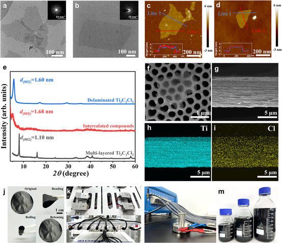 (k-l)电化学剥离装置;(m)获得的高产率少层MXenes分散液。