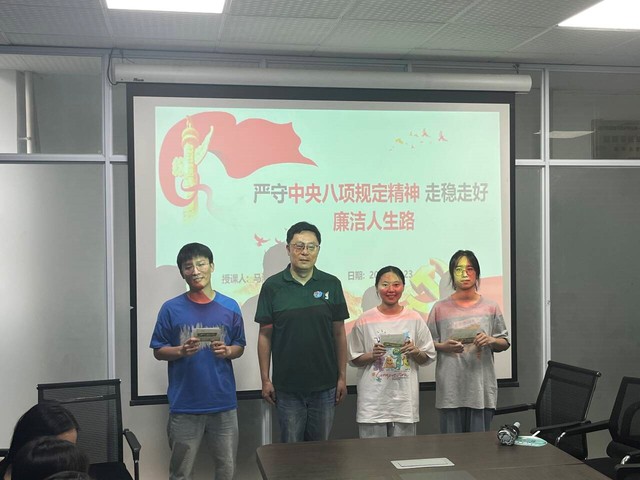 会上,马洪波老师对毕业生党员顺利毕业表示祝贺,希望他们永远保持共产党人的优良作风,踏实工作,努力学习,艰苦朴素。毕业生党员代表发言,感谢母校培养,感谢支部关心,将不负期望。马洪波老师组织全体党员学习《诚信考试违规违纪案例警示》,要求全体党员遵守学校规章制度,切勿违规违规。马洪波老师为全体党员讲题目为《严守中央八项规定精神 走稳走好廉洁人生路》的专题党课,要求全体学生党员保持“实”的作风,树立正确的世界观、人生观、价值观,明大德、守公德、严私德,清清白白做人、干干净净做事,扣好第一粒扣子。最后,马洪波老师还向毕业生党员赠送了纪念品(千里江山图创意金属书签尺),期望他们胸怀天下,以党规党纪为“尺”正身立行。