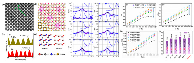 热电材料可实现热能与电能的相互转换,在工业余热发电、汽车发动机余热发电、航天航空核热电池等方面具有潜在的应用前景。利用掺杂、引入缺陷工程以及原位自生第二相大小和形貌调控等手段来提升18/19电子half-Heusler合金电导率及功率因子的同时降低热导率,达到大幅提升热电性能及转换效率的目的。结合第一性原理计算揭示其电-声输运机制,解耦热电参数耦合作用,为提升热电材料性能提供更多解决方案。