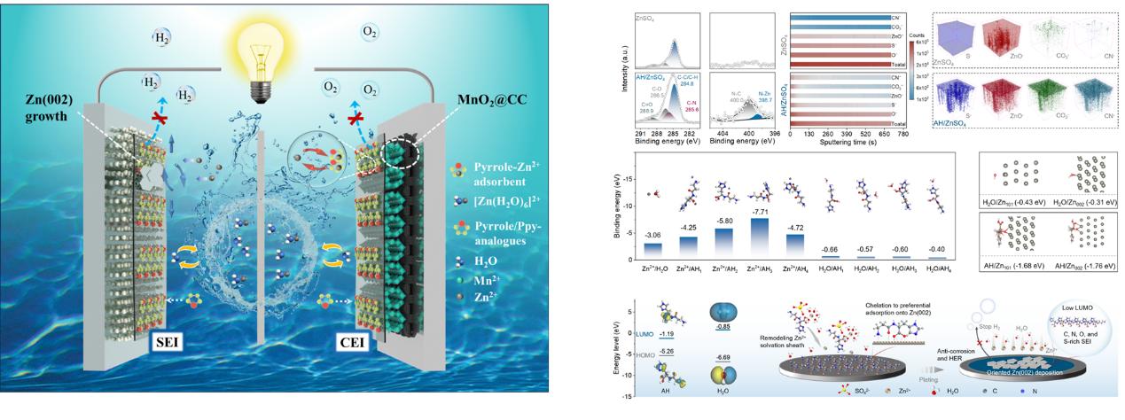 通过多功能添加剂原位吸附-分解构建锌负极表面功能性保护膜,或基于酸刻蚀法调控锌金属负极表面粗糙度和形貌,抑制锌表面腐蚀反应和锌枝晶生长,实现长寿命的锌金属负极。