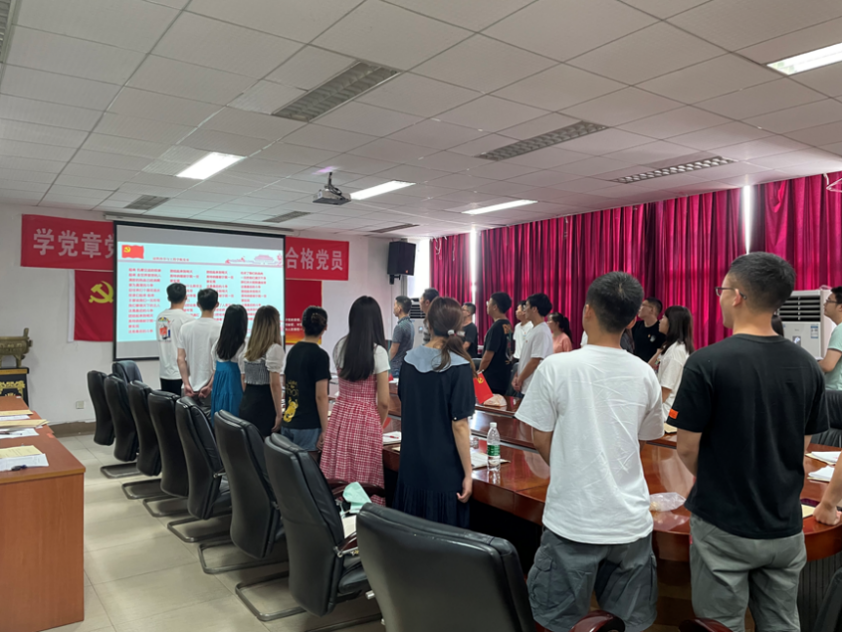 在学生党员莫钦的领誓下,与会党员佩戴党员徽章,庄严地举起右手,面向党旗,共同重温入党誓词,表达了为共产主义事业奋斗终身的理想和信念。