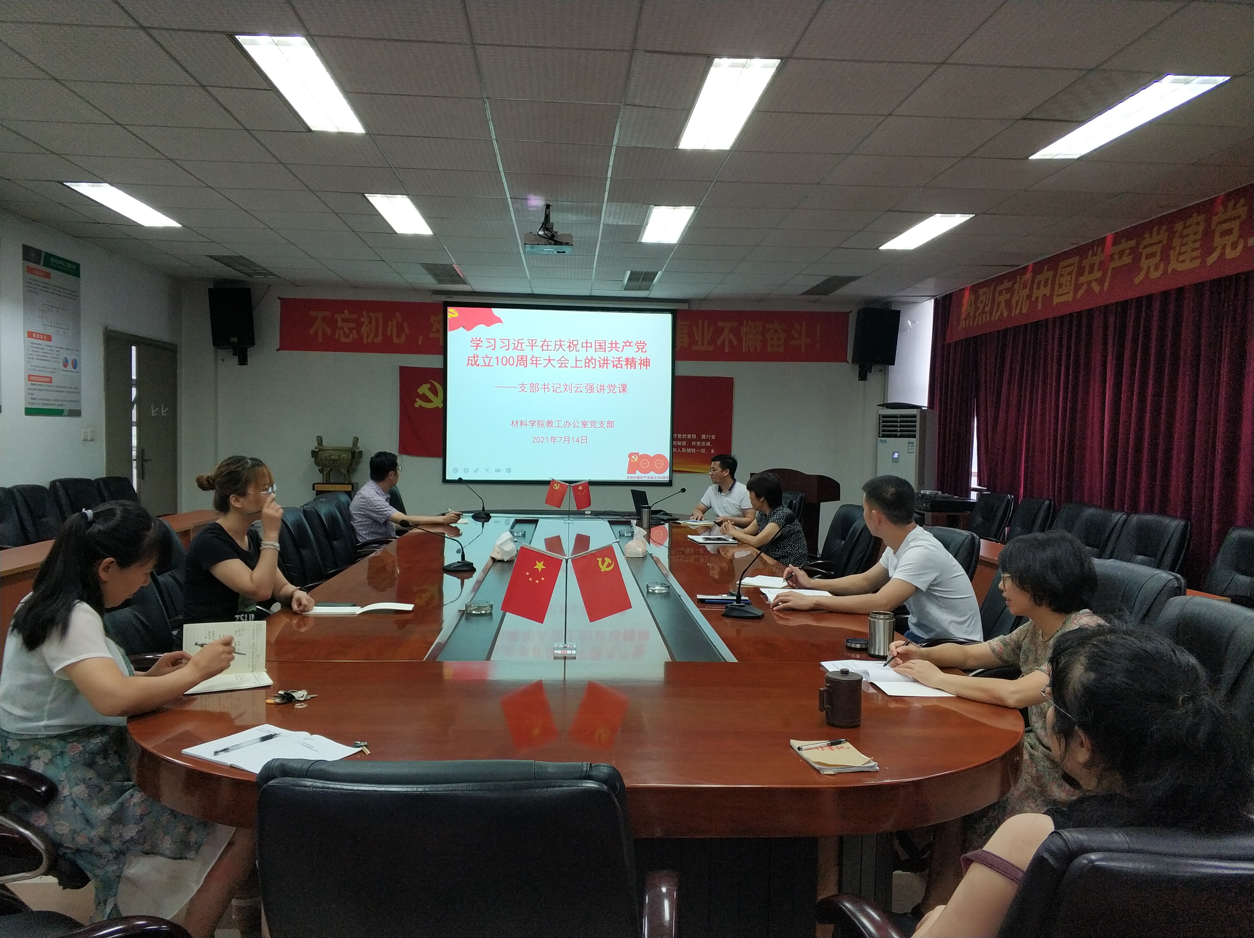 为深入学习领会习近平总书记在庆祝中国共产党成立100周年大会上的重要讲话精神,推动“七一”重要讲话精神的研究阐释和学习宣传,进一步凝聚思想共识,并以学习贯彻“七一”重要讲话精神为重点,进一步推动党史学习教育走深走实,7月14日,材料学院教工办公室党支部召开了学习贯彻习近平总书记在庆祝中国共产党成立100周年大会上的重要讲话精神专题党课,并组织开展了专题组织生活会。