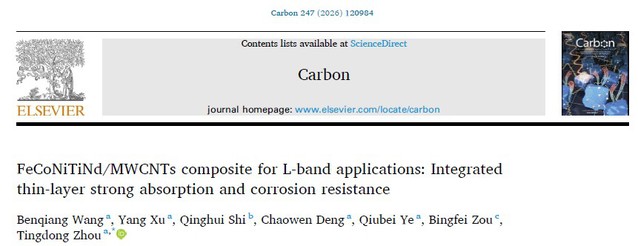为解决吸收剂在L波段(1-2 GHz)吸波性能不足,以及材料耐蚀性差的问题,团队通过机械合金化工艺成功制备了FeCoNiTiNd高熵合金与碳纳米管的复合材料。利用多壁碳纳米管来增强介磁协同效应并优化阻抗匹配,同时通过其物理阻隔作用延缓腐蚀介质渗透,从而实现L波段电磁波的强吸收,同时兼备优异的耐蚀性,为苛刻服役环境下高性能低频吸波材料的开发提供了新策略。相关论文《FeCoNiTiNd/MWCNTs composite for L-band applications: Integrated thin-layer strong absorption and corrosion resistance》发表在国际TOP期刊《Carbon》,第一作者为硕士研究生王本强。