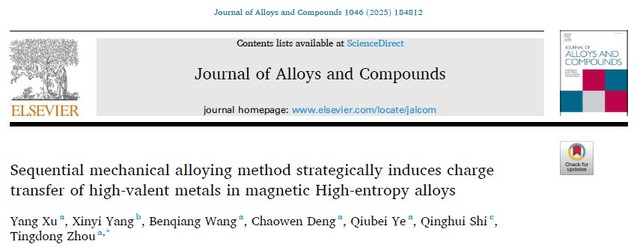 为解决高熵合金的制备问题,团队提出了一种顺序机械合金法方法。通过改变金属粉末的添加顺序,诱导高熵合金基础相转变,可编程设计高熵合金的最终固溶体相结构,有效延缓磁导率随频段增加而衰减的趋势,并且采用第一性原理计算对合金顺序进行了模拟。相关研究以《Sequential mechanical alloying method strategically induces charge transfer of high-valent metals in magnetic High-entropy alloys》为题,发表于《Journal of Alloys and Compounds》,第一作者为硕士研究生许杨。