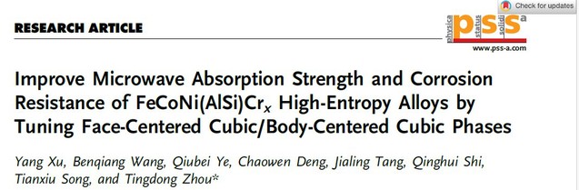 对于高熵合金简单固溶体相的微观相成分设计,团队提出了采用低价态金属诱导体心立方相生成的策略。保留面心立方相的高耐蚀性特征,利用体心立方相的高磁性能,显著降低电磁波吸收剂的复介电常数,优化阻抗匹配。相关研究以《Improve Microwave Absorption Strength and Corrosion Resistance of FeCoNi(AlSi)Crx High-Entropy Alloys by Tuning Face-Centered Cubic/Body-Centered Cubic Phases》为题,发表于《PHYSICA STATUS SOLIDI A》,第一作者为硕士研究生许杨。