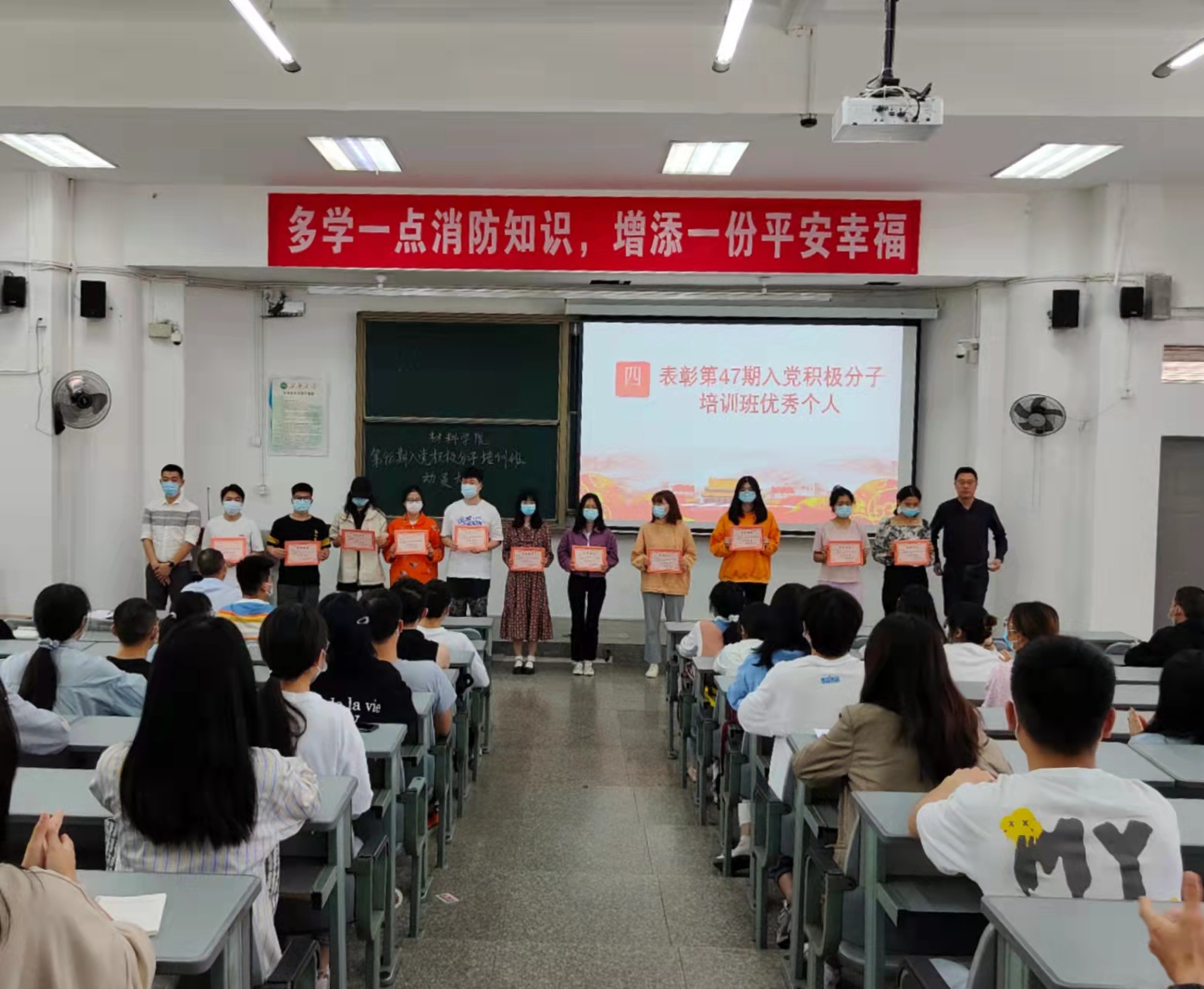 马洪波宣读了《关于表彰党校第四十七期入党积极分子培训班先进集体和优秀个人的决定》,并由与会老师为获得表彰的唐甜等14名同学颁发奖状。