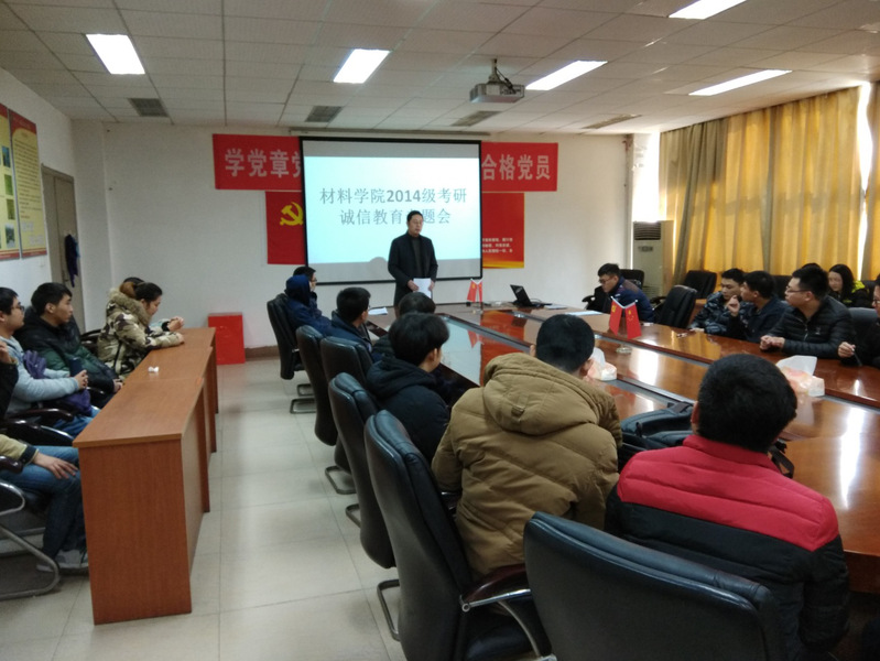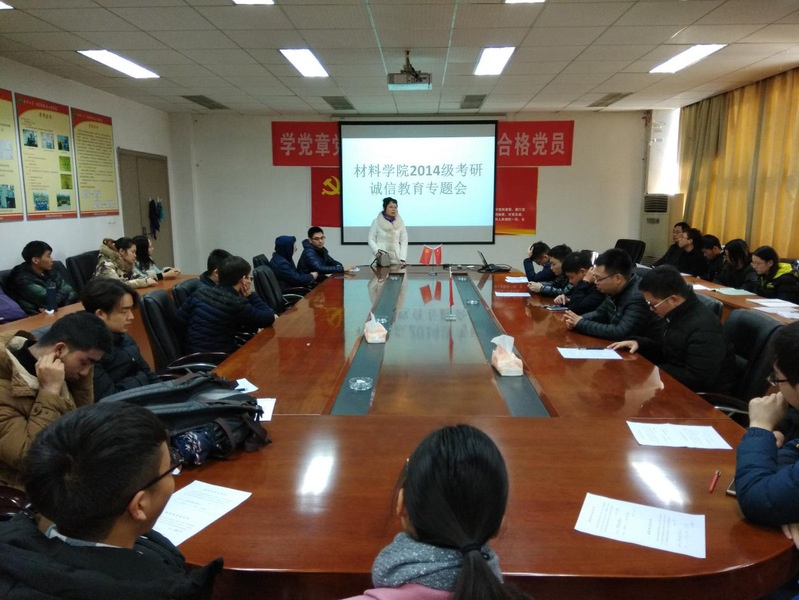 在考研即将来临之际,为了加强同学们诚信考试的正确观念以及强调考研和临考前的各项注意事项,材料科学与工程学院于12月20日中午在5A427会议室举行了2014级考研诚信教育专题会,学院党委副书记马洪波和2014级辅导员饶丽老师在会上针对此次会议主题进行了讲解。