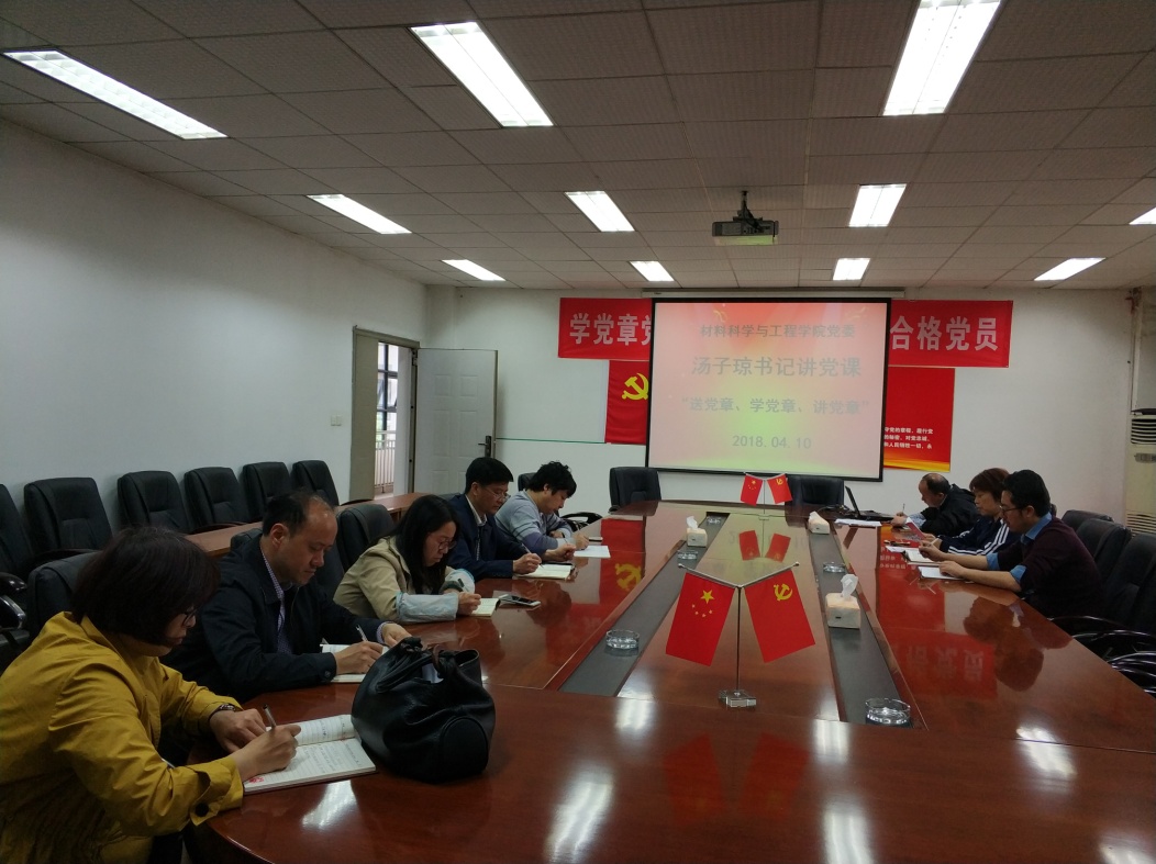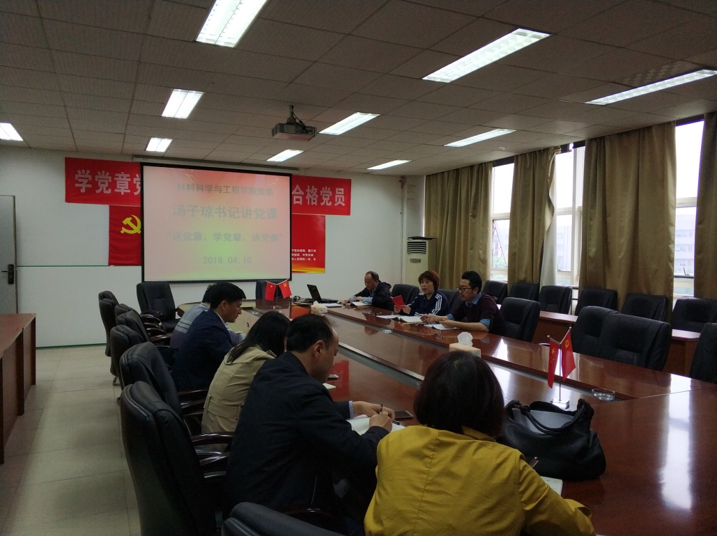 2018年4月10日,材料科学与工程学院党委书记汤子琼在学院会议室5A-427,对学院全体教工支部书记和学生党总支书记以讲党课的形式开展“送党章学党章讲党章”的活动。
