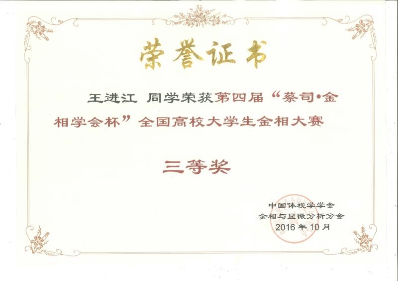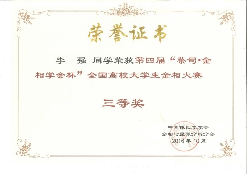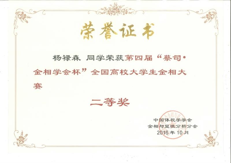 10月14日至16日,第四届“蔡司·金相学会杯”高校大学生金相大赛暨第二届“标乐·金相学会杯”全国高校大学生材料综合技能大赛在武汉科技大学举行。经过三天的激烈角逐,我校材料科学与工程学院杨禄森同学获金相大赛二等奖,王进江、李强同学获金相大赛三等奖,向军、饶丽获“优秀指导教师”称号。