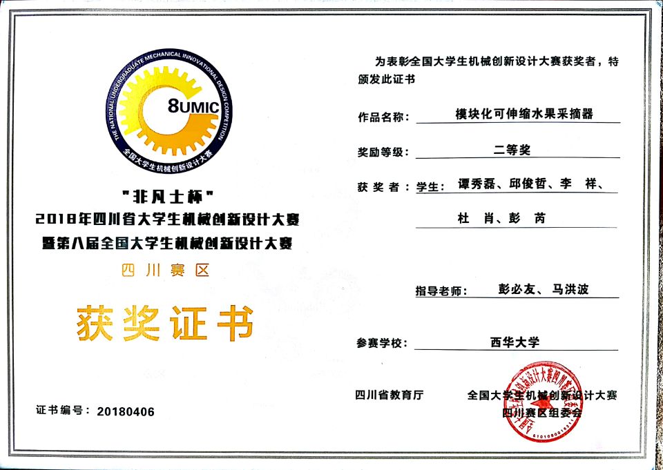 5月5日—6日,由四川省教育厅主办的“非凡士杯”2018年四川省大学生机械创新设计大赛暨第八届全国大学生机械创新设计大赛在西南科技大学举行。我校共10支队伍参加比赛,其中材料学院1支,机械学院9支。经过激烈角逐,我校派出的十支队伍共获得一等奖1项,二等奖2项,三等奖5项,优胜奖2项。我院参赛团队设计并加工的《模块化可伸缩水果采摘器》荣获四川省2等奖。