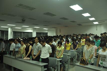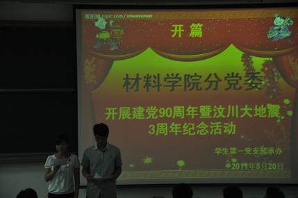 5月20日晚7:30,材料学院分党委在5C104隆重举行建党90周年暨汶川大地震3周年纪念活动,出席活动的有学院党委书记魏远文,院长魏晓伟,副书记谢君,支部书记郭忠林、饶丽以及辅导员张明晖共计300余名党员参加。