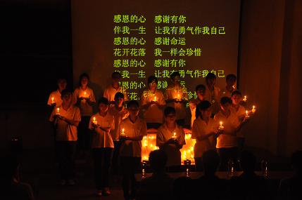 接着由曾就读于北川中学的羌族学生08级材料2班的同学王波富讲述,他用生动的PPT讲述了地震前、地震后以及3周年以来北川人民在党的领导下发生翻天覆地变化的感人故事,在讲述过程中,很多学生党员不禁潸然泪下,为3年以来北川新貌的变化感到激动。分党委书记魏远文在王波富发言后还主动上前拥抱,整个会场气氛非常感人,全场掌声四起。接下来全体党员为地震逝去的同胞默哀1分钟。最后,10几个学生党员从后台拿着蜡烛,唱歌《感恩的心》走到前台,全场领导和同学在他们的带领下,一起唱歌这首歌,整个会场气氛达到高潮。
