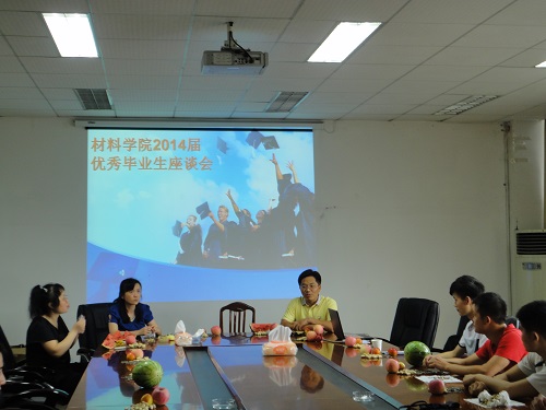 在2014届毕业生即将离校之际,为进一步提升毕业生就业的信心、了解广大毕业生对学院学生管理工作的建议,材料学院于6月23日16点在5A427举行了材料学院优秀毕业生座谈会。材料学院党委书记魏远文教授,党委副书记、副院长谢君老师,材料学院团委书记、2014届班主任饶丽老师等亲临现场,与材料学院2014届各班优秀班委和部分其他优秀毕业生进行了详细交流。
