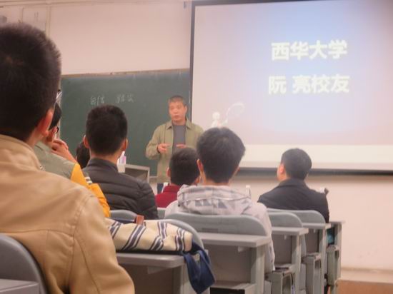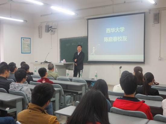 陈启春校友分享了他自己的工作经历。他初来成都时,感觉很多事物都和学校的不同,各种人际关系,利益关系错综复杂,要求我们以后出去工作时多想想,从多方面考虑。他也讲到自信与坚持。他说:“做任何事情都要相信自己。如果自己都信不过自己,别人怎么相信我们?”坚持,这个词说起来容易,做起来难。他说坚持可以磨练出来。比如跑步这一次比上一次多跑一步都是坚持。他说到在坚持的同时不要忘记自己的初衷,不然会一无所获。同时也分享了一个趣事,和一个同事负责一个分公司的项目建立。当他们第一批产品出来的时候,他们只把成本和员工费用加在一起作为售价,可后来总裁却把他们定的售价翻了一倍。他问总裁为什么,总裁说:“知识。”陈启春校友现在告诉我们“知识是可以赚钱的”,因为他们那批货最重要的还是技术方面。他还告诉我们人要慎独,所谓慎独就是诚信与道德。由于“投我以木瓜,报之以琼琚”你的慎独能让你有更广阔的人际关系。