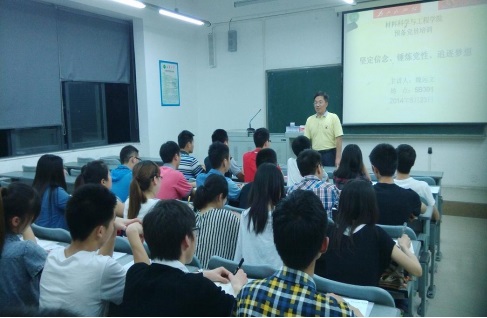 5月23日晚,为进一步提高我院学生党员的党性修养,材料学院在5B301举行“坚定信念、锻炼党性、追逐梦想”为主题的预备党员党性修养培训课,学院党委书记魏远文给2013年新发展的预备党员深入浅出的上了一次党课。会议由学院学生总支书记郭忠林主持。