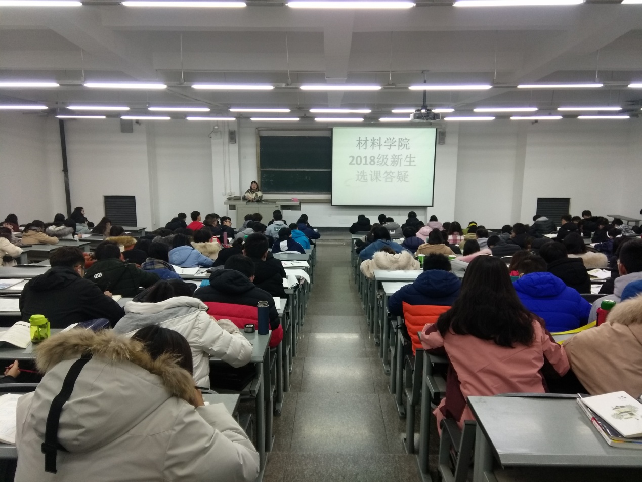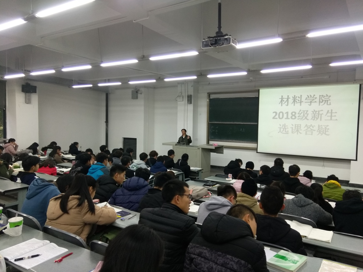 首先由学院党委副书记马洪波作材料学院课程体系情况介绍,强调了毕业最低学分为170分的要求,接着由学院教学科研办主任刘云强做选课指导,特别针对同学们在第一轮选课中存在的课程冲突问题提出了解决问题的方法,接下来又针对其他在第一轮选课中存在的问题进行了逐一答疑。