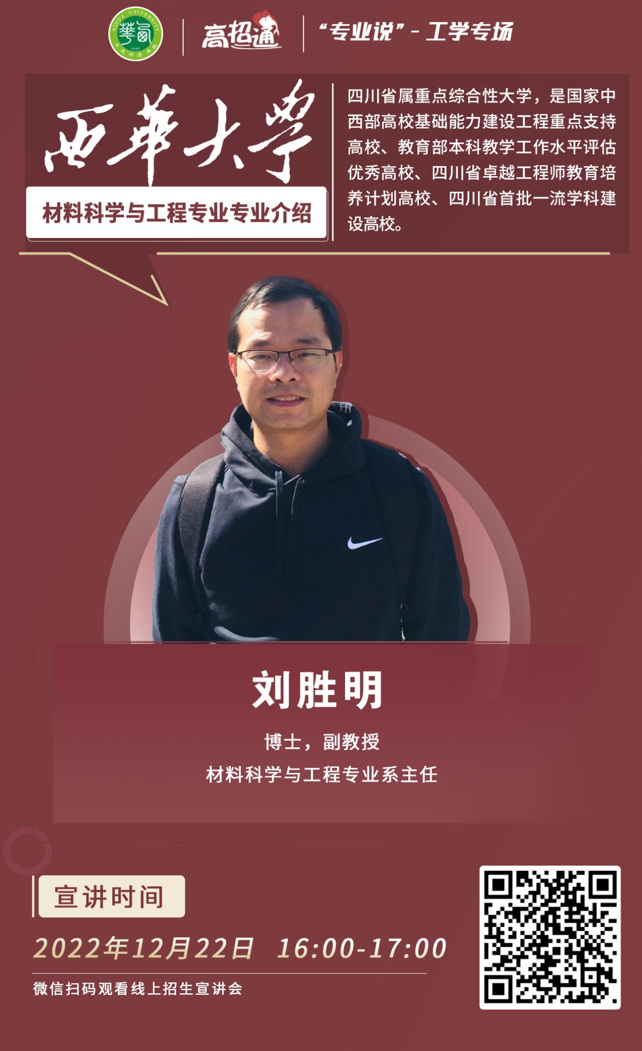 考生及家长可以扫描下面海报上二维码回看刘胜明教授专业介绍直播视频